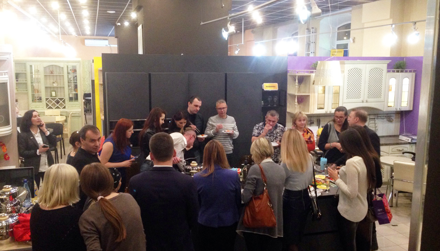 17 марта в главном салоне «Кухни Беларуси» состоялась встреча с дизайнерами интерьера. Мероприятие посетили известные дизайнеры Москвы, представители агентств по дизайну. За фуршетом обсуждались актуальные вопросы оформления интерьера, были представлены оригинальные дизайнерские решения, включая новую линейку кухонь из керамики.