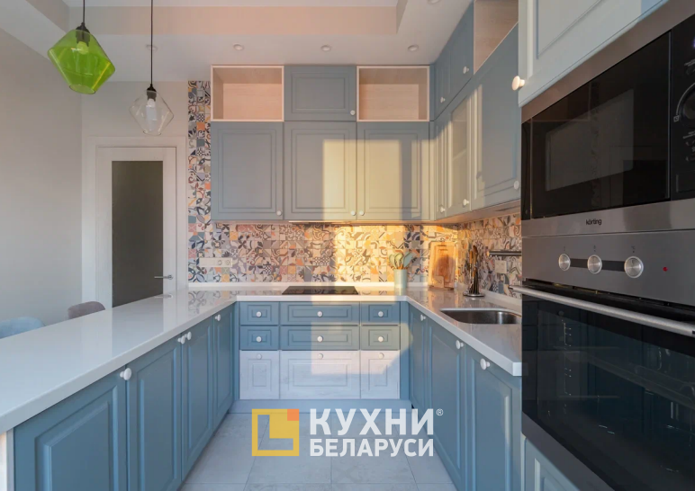 Фасады гарнитура выполнены в небесно-голубом цвете. Каркас — под светлый дуб, столешница — под кварц. Такая цветовая палитра создаст в помещении теплую уютную атмосферу. Разбавляет пастельную нежную гамму яркий узорчатый фартук.