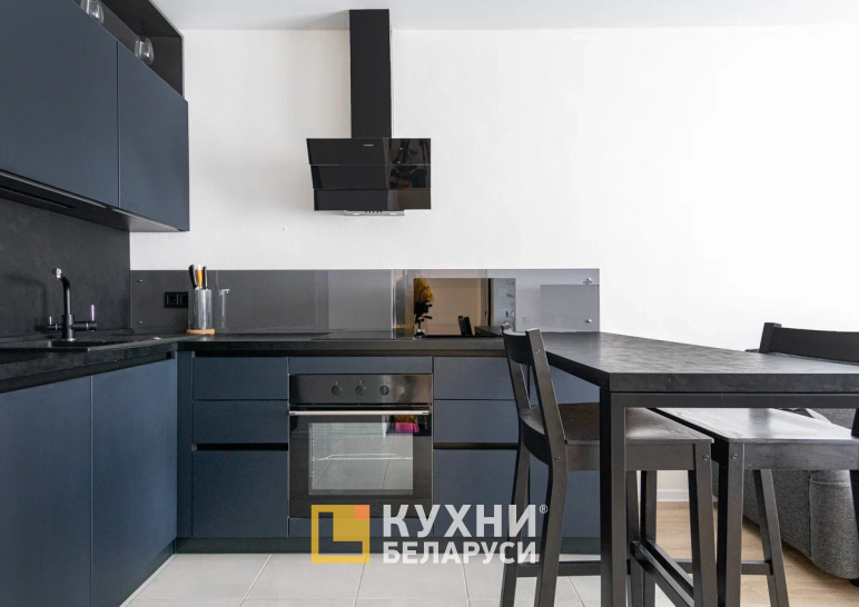 На второй стороне гарнитура навесные шкафчики полностью отсутствуют. Вместо них располагается открытая вытяжка, зона с плитой и ящики. Третья сторона представляет собой полноценный стол для 2-3 человек. Также может выступать в качестве рабочей зоны.