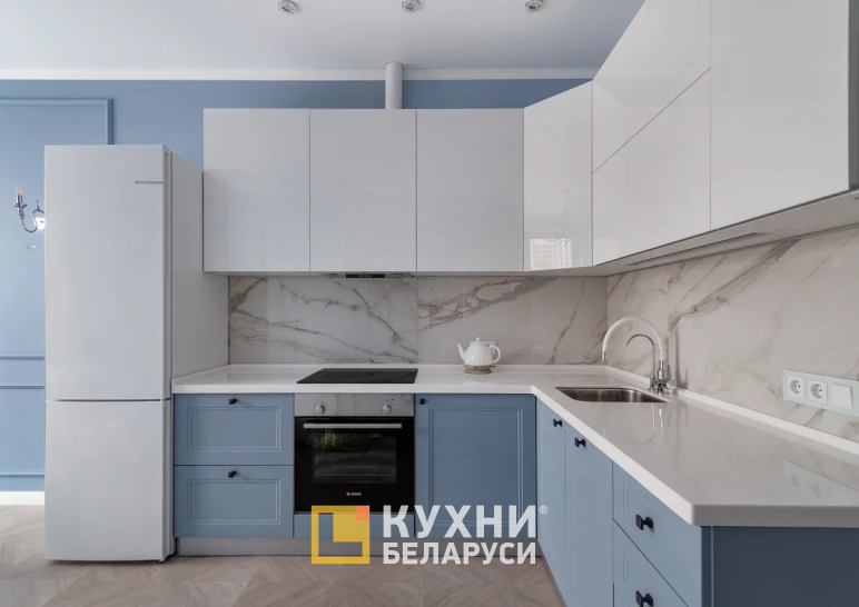 Угловой гарнитур «ПТК308» выполнен в стиле модерн с элементами прованса. Он одинаково подойдет для просторной и средних размеров кухни. У гарнитура двухцветная палитра: верхний ярус — белый, цвет нижнего приближен к бледно-васильковому.