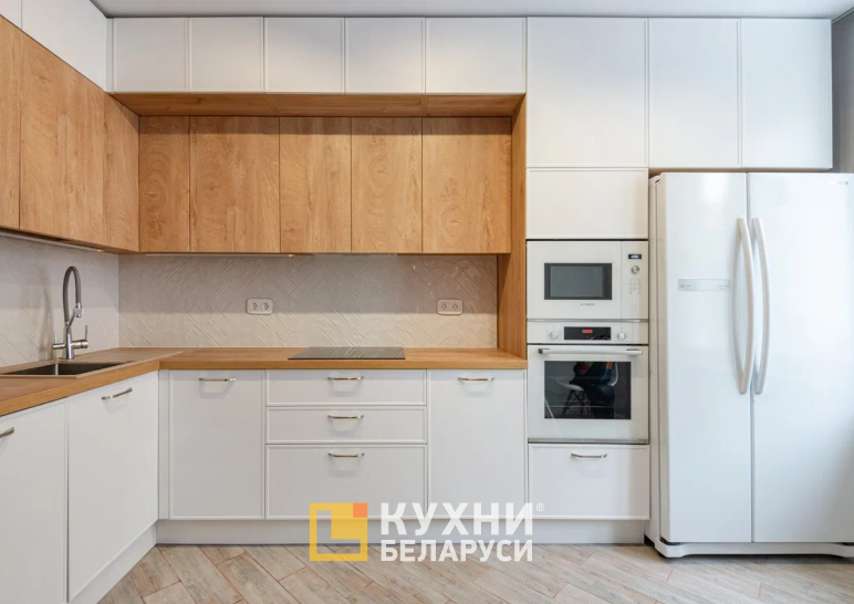 У гарнитура интересный современный дизайн. Навесные шкафы представлены в два ряда. При этом верхний выступает вперед, подчеркивая двухъярусность комплекта. Цветовая палитра также делает акцент на многослойности. Фасады выполнены в белом цвете, корпус, столешница и нижний ярус навесных шкафов — под дерево.