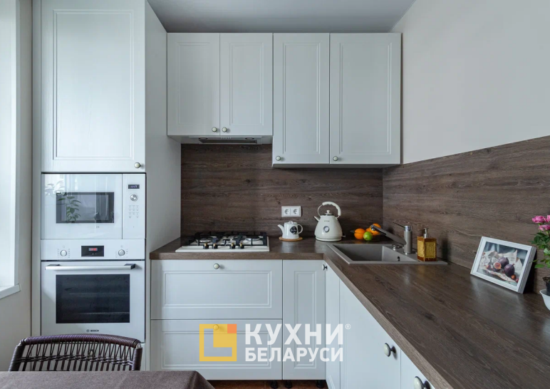 Угловой гарнитур «ПВ363» выполнен в неоклассическом стиле. Преобладание белого цвета и отсутствие верхних шкафов с одной стороны позволяет вписать комплект даже в небольшую кухню. Он не нагромождает пространство, а его светлая цветовая гамма добавляет помещению света и легкости. Акцентным элементом выступает столешница и стеновая панель под дерево. Древесный оттенок создает больше уюта и тепла.