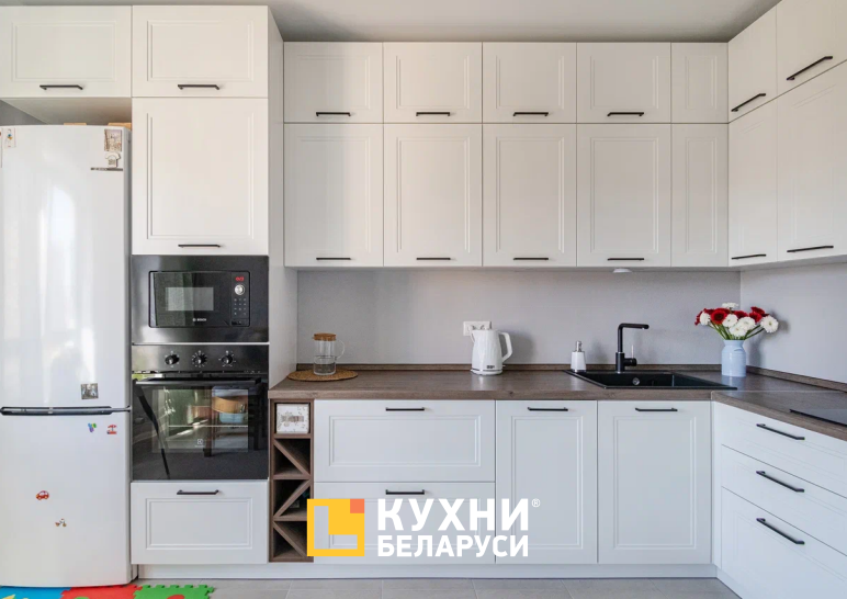 Угловой вместительный гарнитур «ЗПБО131» в стиле неоклассика станет настоящим украшением кухни. Выполненный в белых оттенках, он зрительно не нагружает пространство, а, наоборот, делает его легче и светлее. В отличие от классических гарнитуров здесь нет ярко выраженных украшений. Только рамочные фасады антично белого цвета и контрастирующие на их фоне черные ручки-рейлинги.